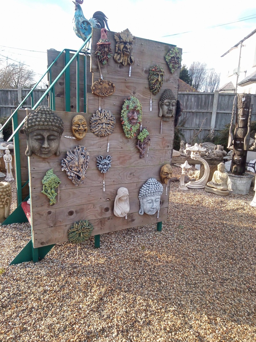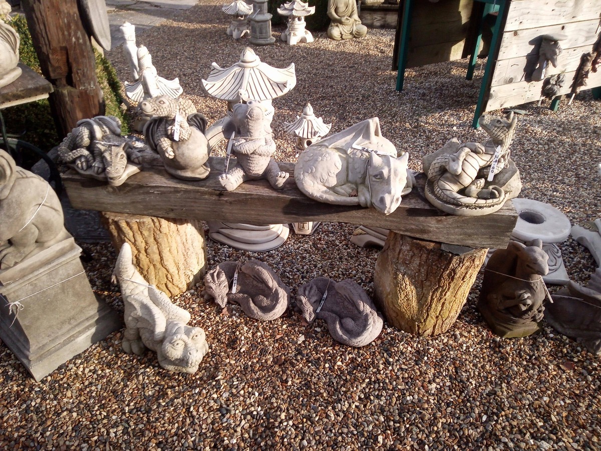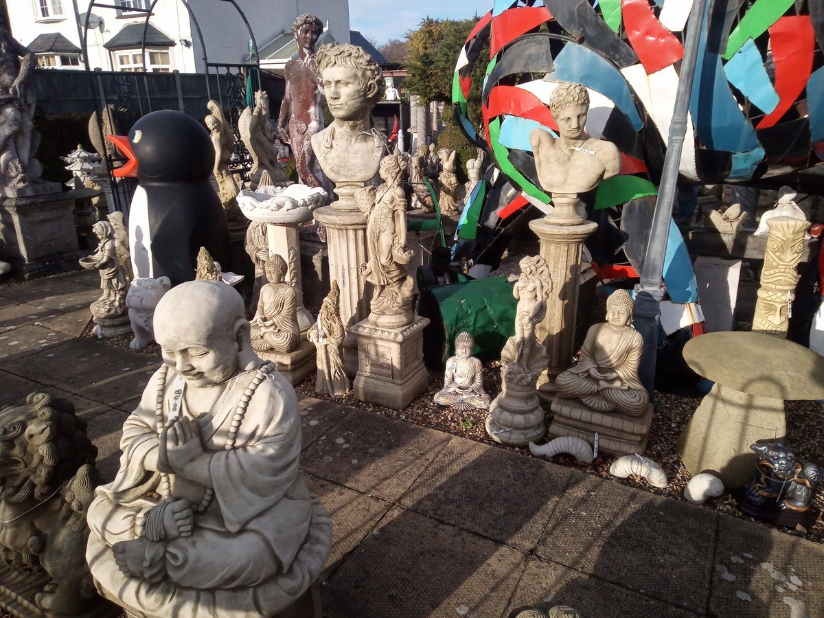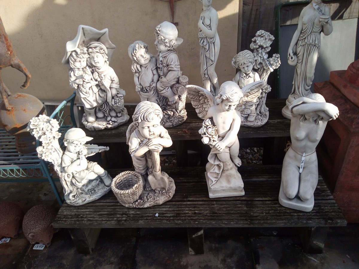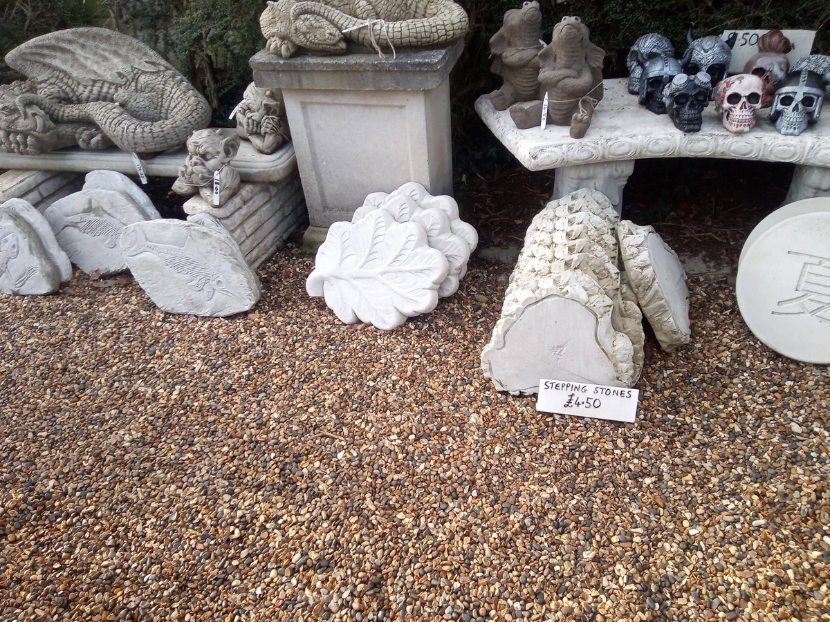 Garden figurines, plaques, foo dogs, cats, pagodas, angels, fairies, tin man, hanging monkeys, gorilla's, Bakers mirrors, metal flower stakes, wall art, cherubs, items suitable for memorials and ashes, spare bird bath top, spare bench and seat tops, Hedleys, Sovereign, Stancombe stone, Astons, Whelans, cement, hand cast painted grey concrete products, reproduction antique ornaments, balls, spheres, pineapples, gardening ideas, gardeners ideas near the ashberry homes elizabeth gardens and bellway developments, come see our display in a unique setting in Rochford Essex UK, maybe visit when you come to the garden show, craft show, fobbing, plant perfections, hyde hall, scott's, altons, woodside, summerhill, southend airport.